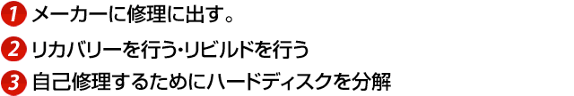 故障機器自体は完璧に動くようになりますが、 ハードディスク内のデータを 捨ててしまったことになり、失うものも大きいです。 メーカー修理に出す前に、データ復旧によりデータを救出してください。
